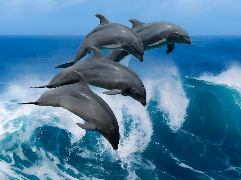 Dolphins are among the most playful and intelligent creatures in the ocean. Known for their sense of humor, they often "play tricks" on other marine animals, darting around them and leaping out of the water in a game of "catch me if you can." Their playful nature and social bonds make them one of the most beloved groups in the animal kingdom. Watching them interact is always a joyful experience.